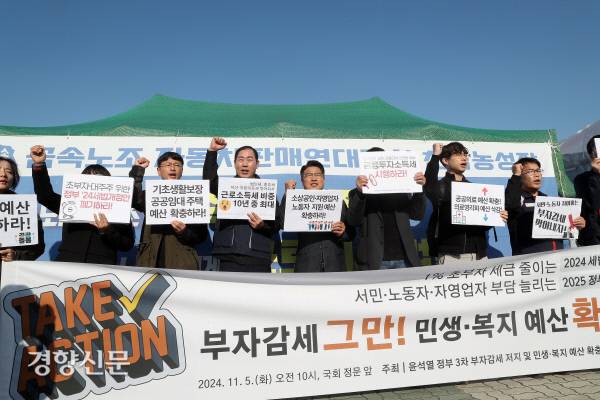 민주노총, 참여연대 등 시민사회단체 활동가들이 5일 서울 여의도 국회 앞에서 '윤석열 정부 3차 부자감세 저지 및 민생ㆍ복지 예산 확충 요구 집중행동 돌입 기자회견'에서 구호를 외치고 있다. 2024.11.5. 정지윤 선임기자