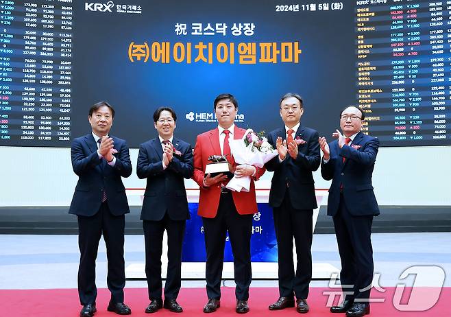 (서울=뉴스1) = 5일 오전 서울 영등포구 한국거래소에서 열린 에이치이엠파마 코스닥시장 상장기념식에서 유도석 한국IR협의회 상무(왼쪽부터), 이충연 한국거래소 코스닥시장본부장보, 지요셉 에이치이엠파마 대표이사, 김준태 신한투자증권 GIB2그룹 대표, 강왕락 코스닥협회 부회장이 기념촬영을 하고 있다. (한국거래소 제공) 2024.11.5/뉴스1