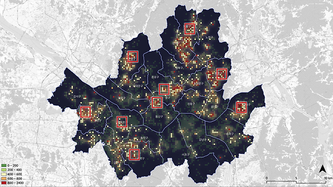 이 질문에 대한 답을 찾기 위해 휴대전화 데이터가 밤 10시부터 새벽 3시까지 머문 흔적을 수집했다. 그리고 서울 전역을 가로세로 250미터 단위로 나눠 '가난한 노인의 밀도'를 표시한 지도를 만들었다.