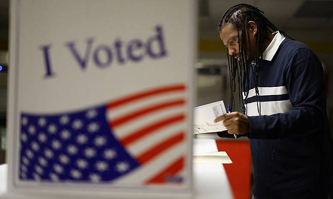 | 펜실베이니아의 승자는 미국 제47대 대통령 선거일인 5일(현지시간) 펜실베이니아주 피츠버그에서 한 남성이 투표하고 있다. 펜실베이니아는 19명의 선거인단을 가진 이번 대선 최대의 승부처로 불린다. 이번 대선에서 박빙 레이스를 펼친 민주당 후보 카멀라 해리스 부통령과 공화당 도널드 트럼프 전 대통령은 전날 초경합 상황인 펜실베이니아를 찾아 마지막 유세를 했다. 피츠버그=로이터연합뉴스 |