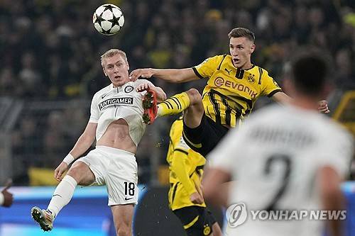 Sturm's Mika Biereth, left, challenges Dortmund's Nico Schlotterbeck during to the Champions League opening phase soccer match between Borussia Dortmund and Sturm Graz in Dortmund, Germany, Tuesday, Nov. 5, 2024. (AP Photo/Martin Meissner)