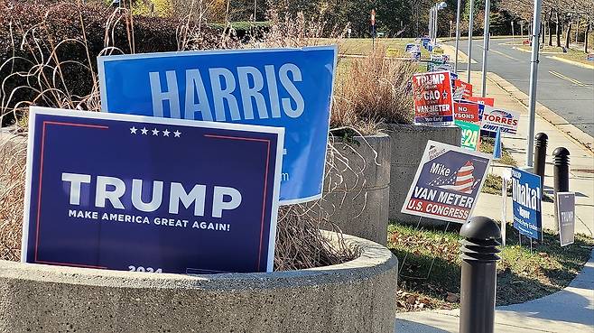 (워싱턴=연합뉴스) 김동현 특파원 = 미국 대통령 선거가 실시된 5일(현지시간) 미국 버지니아주 페어팩스 카운티 정부 청사에 마련된 투표소 앞에 공화당 도널드 트럼프 전 대통령과 민주당 카멀라 해리스 부통령의 이름을 적은 팻말이 설치돼 있다. 2024.11.6