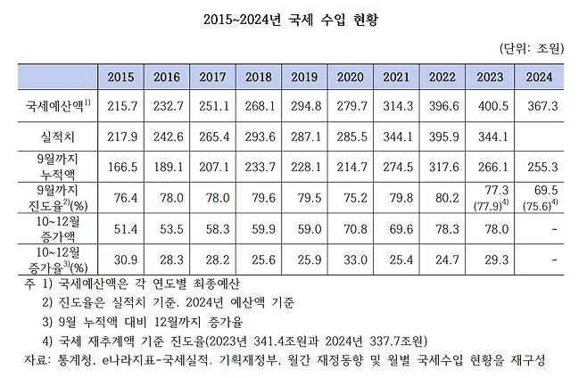 그러나 현재 세수 추이를 보면 이 역시 낙관적인 추계로 보인다. 실제 2024년 국세수입 예산은 전년도 결산액인 344조1000억원보다 23조2000억원 더 많지만, 올해 9월까지 국세 수입이 전년 동기 대비 11조3000억원 줄어들어 예상보다 34조5000억원의 세수 결손이 발생한 상황이다. 경기 상황에 급격한 변화가 없는 한 기재부의 재추계치보다 더 큰 결손이 발생할 가능성이 높다.