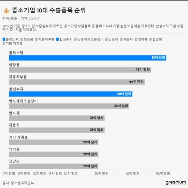 | ▲ 중소벤처기업부에 따르면, 2022년 기준 중소기업 수출품목 중 플라스틱이 수출액 1위를 차지했다. |