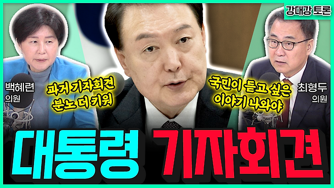 ▷ 고성국 : 내일 대통령 기자회견이 예정돼 있습니다. 11월 말쯤 할 것이라고들 보도가 됐었는데 내일로 앞당겨졌습니다. 앞당겨진 과정에 대한 이야기들도 좀 있고 그렇습니다. 이 상황 어떻게 보고 계신지, 또 어떻게 전망하시는지 국민의힘 최형두 의원부터 발언 시작하시죠