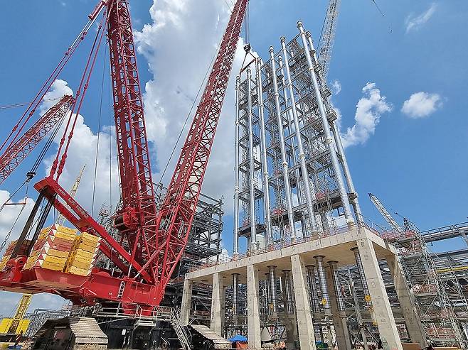 (서울=연합뉴스) DL이앤씨는 미국 텍사스 오렌지카운티에서 진행 중인 '골든 트라이앵글 플리머스 프로젝트'(GTPP) 현장에 '루프 리액터'(Loop Reactor)를 설치했다고 6일 밝혔다. 사진은 '골든 트라이앵글 폴리머스'공사 핵심 기기인 '루프 리액터'설치 현장. 2024.11.6 [DL 이앤씨 제공. 재판매 및 DB금지]