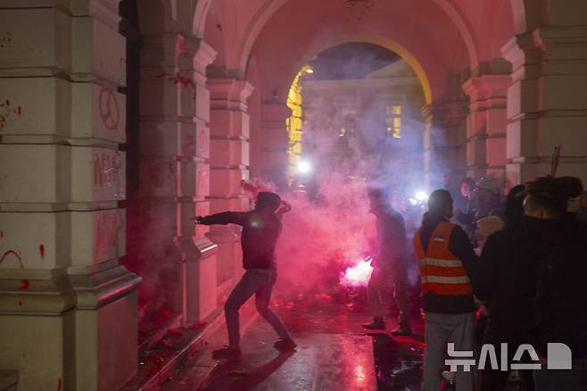 [노비사드=AP/뉴시스] 5일(현지시각) 세르비아 노비사드에서 시위대가 시청 건물에 불꽃을 던지고 있다. 시위대는 지난 1일 철도역 콘크리트 지붕 붕괴로 6세 소녀 포함 14명이 숨진 것을 두고 인재라고 분노하며 거리로 나섰다. 2024.11.06.
