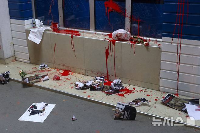 [노비사드=AP/뉴시스] 5일(현지시각) 세르비아 노비사드에 있는 집권 여당 진보당 사무실이 시위대가 뿌린 붉은색 페인트로 얼룩져 있다. 시위대는 지난 1일 철도역 콘크리트 지붕 붕괴로 6세 소녀 포함 14명이 숨진 것을 두고 인재라고 분노하며 거리로 나섰다. 2024.11.06.