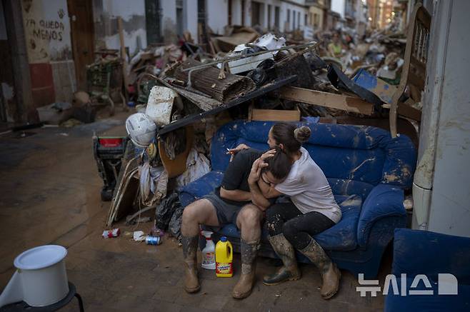 [파이포르타=AP/뉴시스] 5일(현지시각) 스페인 발렌시아주 파이포르타에서 한 가족이 홍수로 침수됐던 집 안에서 일부 세간살이를 수습한 후 포옹하며 서로를 위로하고 있다. 2024.11.06.