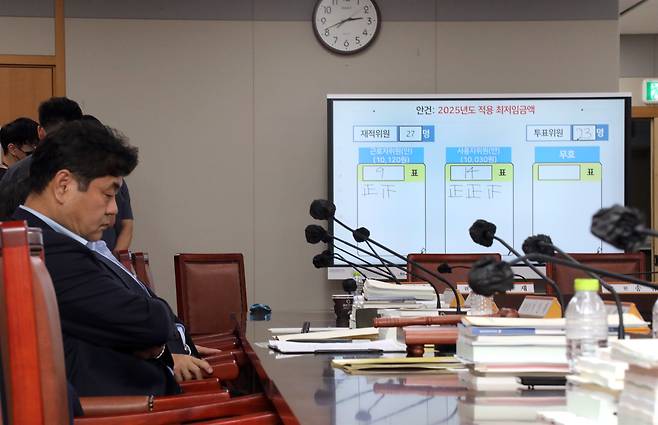 | ▲ 최저임금위원회는 지난 7월 12일 새벽 정부세종청사에서 열린 제11차 전원회의에서 투표를 거쳐 내년 최저임금을 시간당 1만30원으로 결정했다. 사진은 회의가 끝난 뒤 이인재 최저임금위원장이 자리에서 생각에 잠겨 있는 모습. |