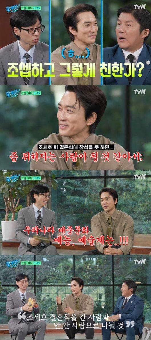 이날 '유 퀴즈 온 더 블럭'에는 배우 송승헌이 게스트로 출연했다. 유재석은 "조셉 결혼식에 많은분들이 왔지만 승헌씨가 와있더라. 조셉하고 그렇게 친한가? 몰랐다. 왜냐면 조셉 친한분들 웬만큼 얘기들어서 제가 아는데"라고 조세호 결혼식에 참석하게 된 계기를 물었다.