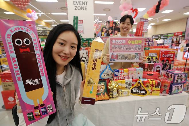 (서울=뉴스1) 박세연 기자 = 6일 서울 중구 이마트 청계천점에서 모델들이 ‘롯데 뉴진스 빼빼로 기획 5종’을 비롯한 수험생에게 선물하기 좋은 과자류를 선보이고 있다.