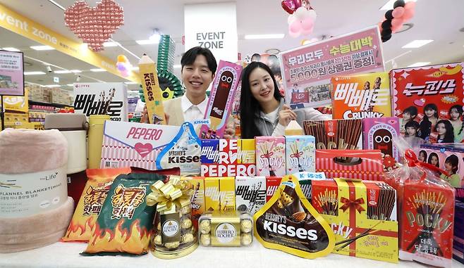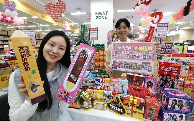 6일 서울 이마트 청계천점에서 모델들이 '수능&빼빼로데이' 기획전을 홍보하고 있다. 이마트는 빼빼로, 초콜릿 등 수험생에게 선물하기 좋은 과자류 행사 상품을 25,000원 이상 구매하는 고객에게 신세계상품권을 증정한다. ‘롯데 뉴진스 빼빼로 기획 5종은 10입 기준 14,400원에 판매한다.