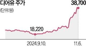6일 디어유는 3만8700원에 거래를 마쳤다. 이날 1.28% 하락했으나 지난 9월 연저점(1만8220원)에 견줘 두 배 이상 높은 가격이다. 디어유는 인기 한류 팬덤 플랫폼 ‘디어유 버블’을 운영하고 있다. 중국 진출 기대 등으로 한 달 사이 90.64% 급등했다.