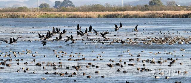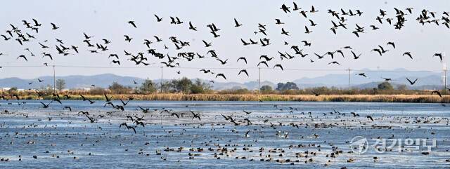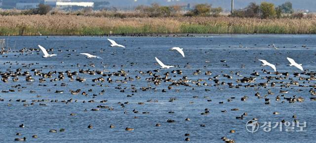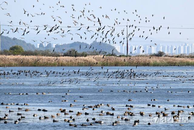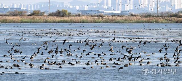 시화호에 겨울철새들이 돌아왔다. 입동을 하루 앞둔 6일 월동을 위해 시화호 철새도래지를 찾은 청둥오리, 기러기, 흑꼬리도요, 노랑부리저어새 등 수만마리가 하늘 위로 비상하고 있다.