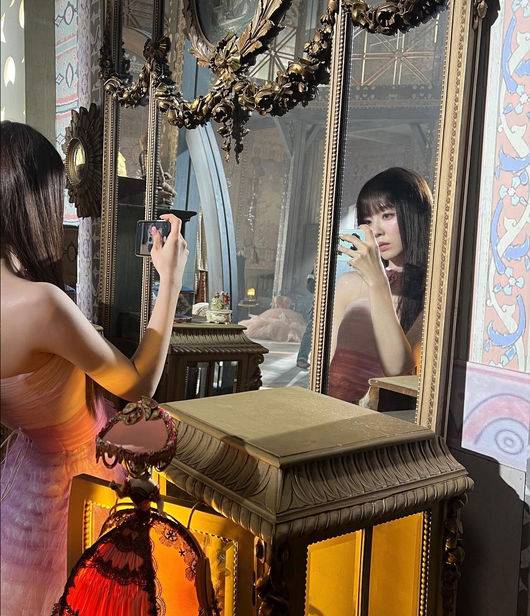 거울을 바라보고 있는 아이린은 미모에 도취된 모습을 보인다.