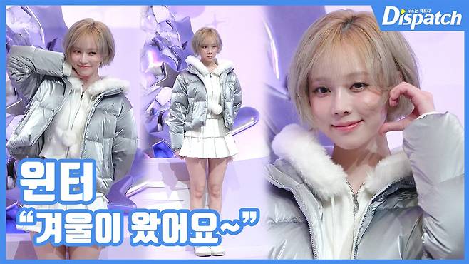 이날 윈터는 패딩에 미니스커트를 매치하며 다가오는 겨울 사랑스러운 패션을 완성했다.