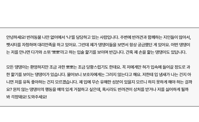 반려견은 악의가 없는 행동이라 할지라도 인간의 입장에서는 거절하고 싶을 수 있습니다. 사연자분은 반려견의 행동을 거절하고 싶지만 적절한 방법을 모르셔서 당황하신 것 같아요. 사실 반려견의 행동을 예의 있게 거절하는 방법은 쉽습니다. ‘반려견은 악플보다 무플을 더 무서워한다’라는 설채현 수의사님의 말처럼, 반려견이 원하는 것을 반려견에게서 떼어놓기만 하면 됩니다. 오늘 사연의 경우에는 사연자의 입이겠죠?