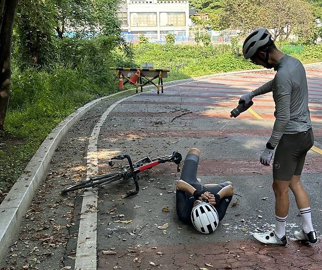 | ▲ '봉크'로 쓰러진 동호인 이씨 성남시 분당구 석운동 여우고개 정상에서 쓰러진 동호인 이씨. 봉크로 몸을 움직일 수 없는 그에게 동료가 물을 뿌려주며 각성을 유도하고 있다. |