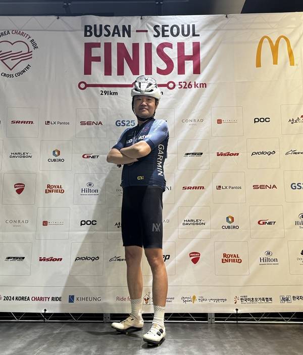 | ▲ 서울-부산 간 530km를 이틀만에 라이딩 하는 '코리아 채리티 라이드' 종료 후 이씨 2일차 230km를 달린 직후이지만, 그의 얼굴엔 여유가 있었다. |