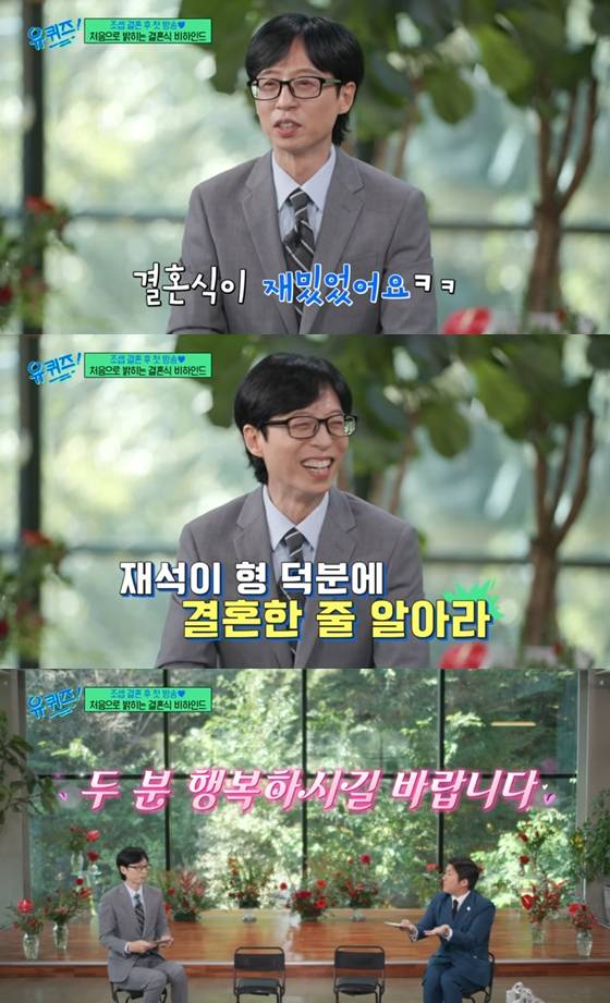 조세호의 결혼식에 참석한 유재석은 "식사에도 신경을 많이 썼더라"라며 흐뭇한 모습을 보였다.