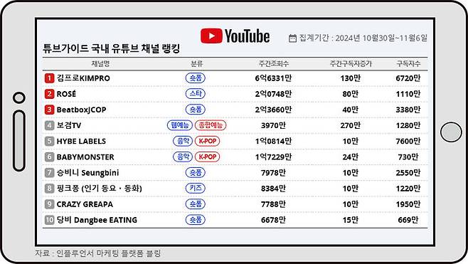 7일 튜브가이드가 발표한 11월 첫째주 국내 유튜브 채널 순위를 보면 베이비 몬스터 공식 채널(@BABYMONSTER)은 지난달 30일부터 전날까지 주간 조회수 1억7229만회, 주간 구독자수 24만명, 구독자수 730만명으로 전체 6위에 올랐다.