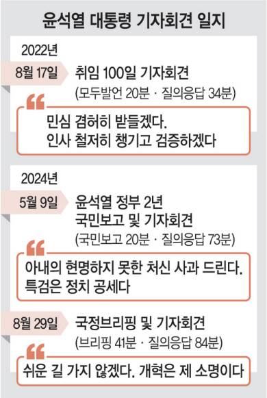 또 윤 대통령은 원고를 띄우는 프롬프터 등 보조 장치 없이 즉문즉답 방식으로 취재진의 질문에 답했다. 지난 기자회견에 비해 윤 대통령의 단상과 취재진 의자 사이 거리도 1m 이상 좁혔다고 한다. 기자단 의자는 윤 대통령 단상을 감싸는 형태로 배치됐다. 대통령실 관계자는 “국민과 더 가까워지겠다는 대통령의 결정으로 이뤄진 조치들”이라고 했다. 윤 대통령은 답변 내내 “솔직하게 다 말하는 것” “풀어 말하겠다” “약간 길게 말하겠다”며 가감 없이 진솔한 자세로 이번 담화에 나섰음을 강조했다. 김 여사 또는 명 씨 관련 의혹 등 불편한 질문을 받을 때도 당시 상황을 자세하게 밝히며 적극적으로 해명했다.