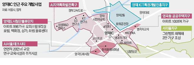 ‘직주근접’에 대한 기대도 크다. 서울시와 서초구 주도로 이 일대에 인공지능(AI) 앵커시설을 짓고, 이 시설을 중심으로 AI 기업을 유치하기 위한 민간 개발을 유도하고 있어서다. 지난 5월 앵커시설로 문을 연 서울AI허브 메인센터에 KAIST AI대학원과 관련 기업이 입주했다. 2030년엔 양재 도시첨단물류단지 옆 양곡도매시장 부지에 연면적 20만㎡ 규모 연구·교육시설과 주거시설을 갖춘 AI서울 테크시티가 들어선다. 남쪽 양재동 KCTC 부지엔 AI 기업을 위한 강남데이터센터와 연구시설도 지어진다.
