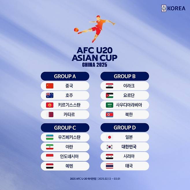 한국은 7일 중국 선전에서 열린 2025 AFC U-20 아시안컵 본선 조 추첨에서 일본, 시리아, 태국과 함께 D조에 배정받았다.