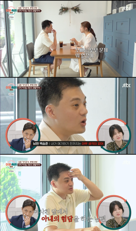 남편은 예전 회사에서 알게된 여사친을 만나기도. 남편은 “말을 뱉으면 책임을 져야하는데 내가 얘기하기 전까지는 아무 생각이 없어. 내가 이걸 가르쳐야 하냐고. 대XX 꽃밭”이라며 여사친 앞에서 아내 험담을 했다. 남편은 친구가 심리쪽으로 공부를 하고 있어서 조언을 구했다고 밝혔다.