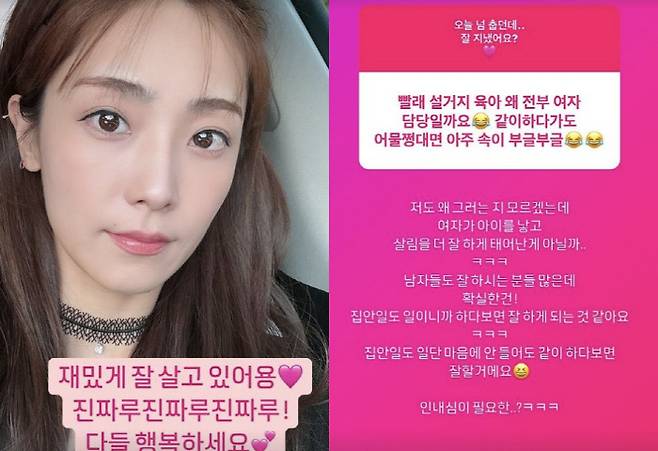 소율은 7일 팬들의 질문에 답하는 시간을 가졌다. 한 네티즌은 "빨래, 설거지, 육아 왜 전부 여자 담당일까요. 같이 하다가도 어물쩡대면 아주 속이 부글부글"이라고 토로했다.