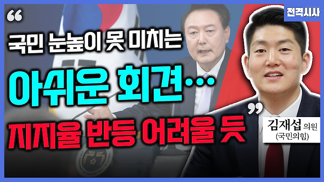 ▶ 김재섭 : 저는 지금 어려운 난맥상을 타개하기에는 어려웠다고 생각합니다. 왜냐하면 제가 반복적으로 말씀드린 대로 이번 기자회견 자체가 저만 그렇게 평가하는 것이 아니라 저도 그래서 아침에 조간신문들을 쭉 다 봤는데 모든 언론사에서 대통령의 기자회견에 대해서 후한 평가를 내리고 있지는 않더라고요. 굉장히 혹평을 한 것이 대부분의. 대부분 아니라 거의 모든 사설들이 다 그렇게 이야기를 하고 있다면 그것이 단순히 언론사의 견해나 저의 개인적인 견해뿐만이 아니라 국민들이 그 기자회견을 보는 어떤 감도라고 하는 것이 그럴 것이다라고 저희가 충분히 예측할 수가 있을 텐데 만약에 국민들께서 언론사들이 혹평을 했던 것 그리고 제가 좀 아쉽다는 평가를 했던 것과 비슷하게 느낀다면 지금 대통령이 마주하고 있는 지지율 난맥상을 돌파하기에는 아무래도 좀 부족하지 않았을까라는 생각이 듭니다.