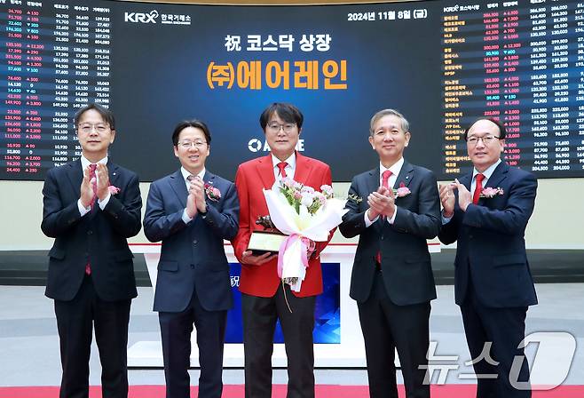 (서울=뉴스1) = 8일 오전 서울 영등포구 한국거래소에서 열린 에어레인 코스닥시장 상장기념식에서 상장기념패 전달 후 김대영 한국IR협의회 부회장(왼쪽부터), 이충연 한국거래소 코스닥시장본부장보, 하성용 에어레인 대표이사, 황성엽 신영증권 대표이사, 강왕락 코스닥협회 부회장이 기념촬영을 하고 있다. (한국거래소 제공) 2024.11.8/뉴스1