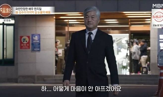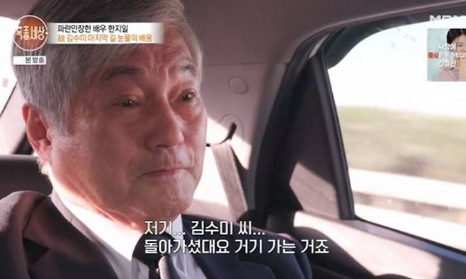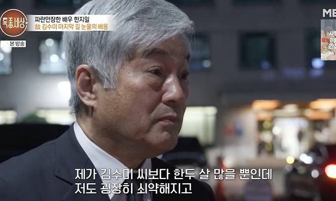 한지일은 동료였던 故 김수미의 비보를 듣고 빈소를 찾았다. 그는 "김수미 씨가 돌아가셨대요. 거기에 간다"라며 충격을 받은 모습을 보였다. 한지일은 "어떻게 마음이 안 아프겠냐. 제가 김수미 씨보다 1~2살 많은 상황이고, 제 걸음걸이도 상황을 모르니까. 저도 이제 저 세상 갈 생각을 하고 있는 거다"라고 말했다.
