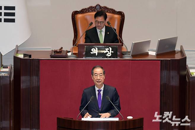 한덕수 국무총리가 4일 서울 여의도 국회에서 열린 제418회국회(정기회) 제11차 본회의에서 윤석열 대통령을 대신해 2025년도 예산안 및 기금운용계획안에 대한 정부 시정연설을 하고 있다. 대통령 예산안 시정연설을 총리가 대독한 것은 지난 2013년 이후 11년 만이다. 윤창원 기자
