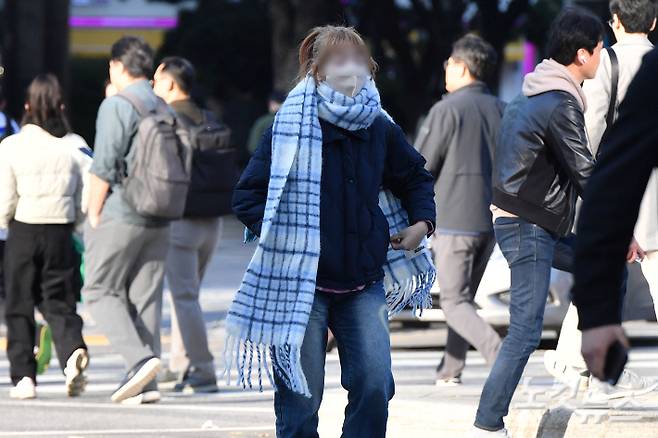 아침 기온이 전날보다 10도가량 뚝 떨어지면서 초겨울 날씨를 보이는 5일 오전 서울 종로구 광화문네거리에 목도리를 두른 시민이 발걸음을 옮기고 있다. 류영주 기자
