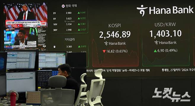 7일 오전 서울 중구 하나은행 딜링룸 전광판에 미국 대선 관련 뉴스가 나오고 있다. 원·달러 환율은 전 거래일 주간거래 종가(1396.2원)보다 5.8원 오른 1402.0에 출발했다. 황진환 기자