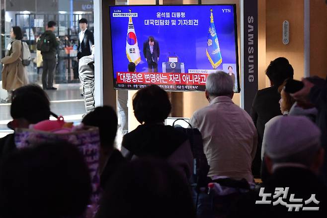 7일 오전 서울 중구 서울역 대합실에서 시민들이 윤석열 대통령의 대국민 담화 및 기자회견을 지켜보고 있다. 류영주 기자