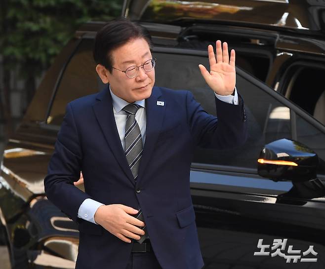더불어민주당 이재명 대표가 8일 오전 서울 서초구 서울중앙지법에서 열린 '대장동 배임·성남FC 뇌물' 관련 1심 속행 공판에 출석하며 지지자들에게 손을 흔들고 있다. 황진환 기자