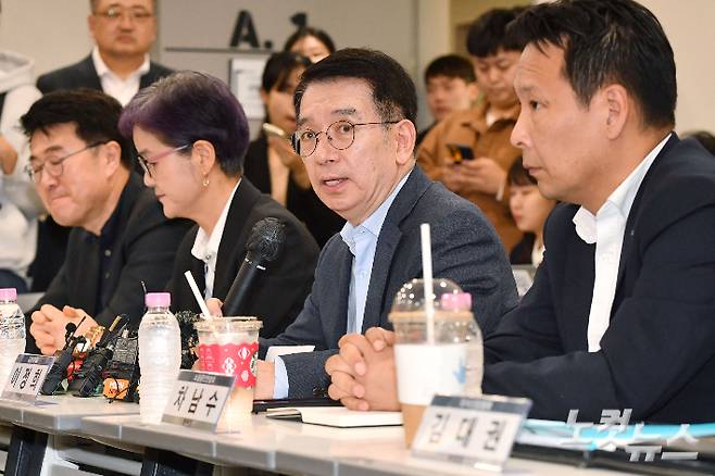 오는 9일 '1차 윤석열 정권 퇴진 총궐기'를 앞둔 윤석열정권퇴진운동본부(준) 관계자들이 4일 오후 서울 종로구 세종문화회관 앞에서 '윤석열 정권 퇴진 10만 총궐기 선포 기자회견'을 갖고 있다. 윤석열정권퇴진운동본부는 9일 숭례문 앞에서 1차 윤석열 정권 퇴진 총궐기 집회를 갖는다고 밝혔다. 황진환 기자