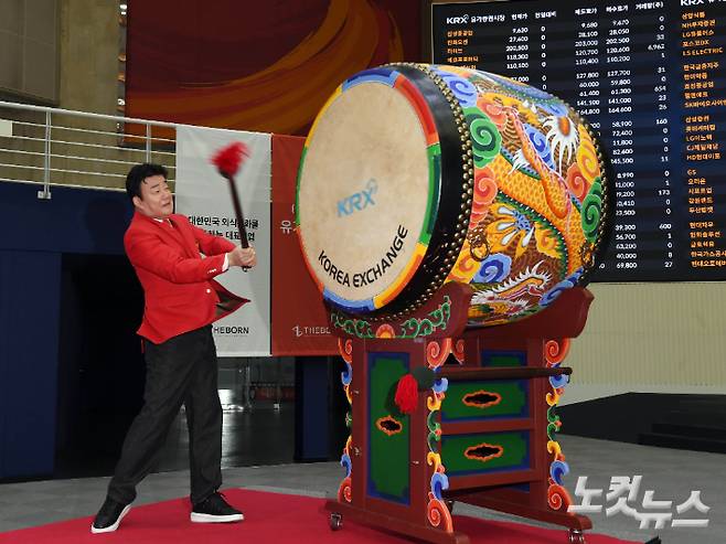 더본코리아 백종원 대표이사가 6일 오전 서울 여의도 한국거래소 홍보관에서 열린 '더본코리아 코스피 상장 기념식'에 참석해 북을 치고 있다. 이날 유가증권시장(코스피)에 상장한 더본코리아는 4만6350원에 거래를 시작해 장 초반 투자자들이 대거 몰리면서 주가가 공모가(3만4천원)를 훌쩍 넘어 6만4500원까지 치솟았다. 백 대표는 더본코리아 주식 879만2850주(60.78%)를 가진 최대 주주이다. 황진환 기자