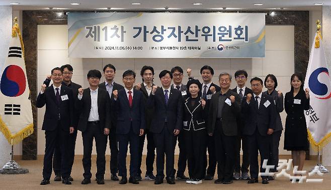 6일 정부서울청사에서 열린 제1차 가상자산위원회 회의에서 김소영(가운데) 금융위원회 부위원장을 비롯한 위원들이 기념 촬영을 하고 있다. 앞으로 가상자산위원회는 법인에 대한 실명계좌 발급을 본격 논의할 방침이다. 박종민 기자