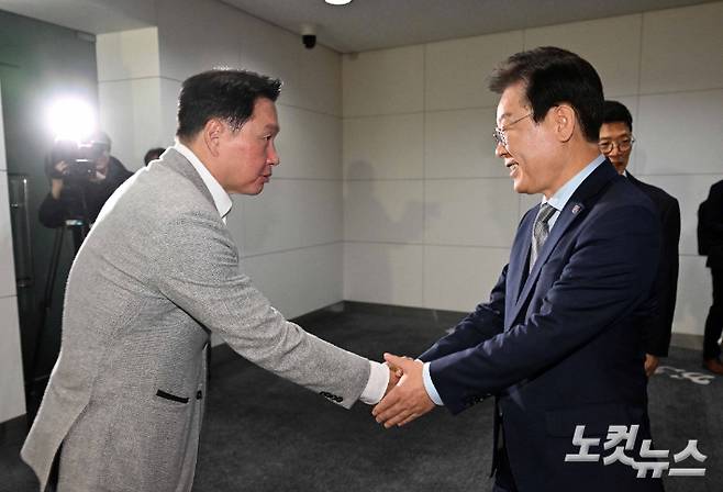 이재명 더불어민주당 대표와 최태원 SK그룹 회장이 4일 서울 강남구 삼성동 코엑스에서 SK AI 서밋 참석에 앞서 악수하고 있다. 이 대표는 지난 9월 국회를 찾은 최 회장과 경제 활성화 방안을 논의한 바 있다. 특히 두 사람은 AI 반도체산업 지원 방안과 첨단산업에 필수적인 에너지 문제에 대해 의견을 나눴다. 국회사진취재단