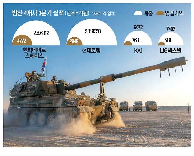 방산 업체 4곳의 올해 영업이익 총액은 2조원을 훌쩍 넘을 것으로 예상된다. 3분기까지 합산한 영업이익이 벌써 1조6957억원이다. 4분기 실적 전망도 밝다. 가격 조건이 국내 납품보다 훨씬 좋은 수출 물량 인도가 순조롭게 이어지고 있기 때문이다.