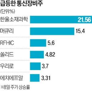 8일 한울소재과학은 21.56% 상승한 6090원에 장을 마감했다. 이 기업은 광전송장비 등 통신장비를 생산한다. 유·무선 공유기와 광케이블 제조업체인 머큐리는 15.40%, 이동통신 기지국용 트랜지스터 기업 RFHIC는 5.6% 올랐다. 쏠리드(4.82%), 우리로(3.70%), 에치에프알(3.31%), 케이엠더블유(2.55%) 등도 일제히 상승했다.