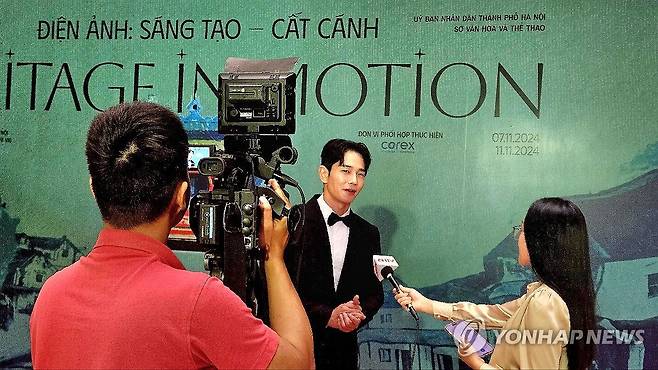 (서울=연합뉴스) 7일(현지시간) 하노이오페라하우스에서 열린 제7회 하노이국제영화제 개막식에 참석한 영화 '투 하트' 주연배우 온주완이 현지 언론과 인터뷰하고 있다. 2024.11.8 [미로비전 제공. 재판매 및 DB 금지]
