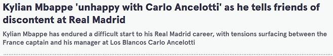 "Kylian Mbappe 'unhappy with Carlo Ancelotti' as he tells friends of discontent at Real Madrid" 킬리안 음바페(25·레알 마드리드)가 카를로 안첼로티(65) 감독에게 불만을 품었다는 영국 매체 '미러'의 충격적인 보도다.