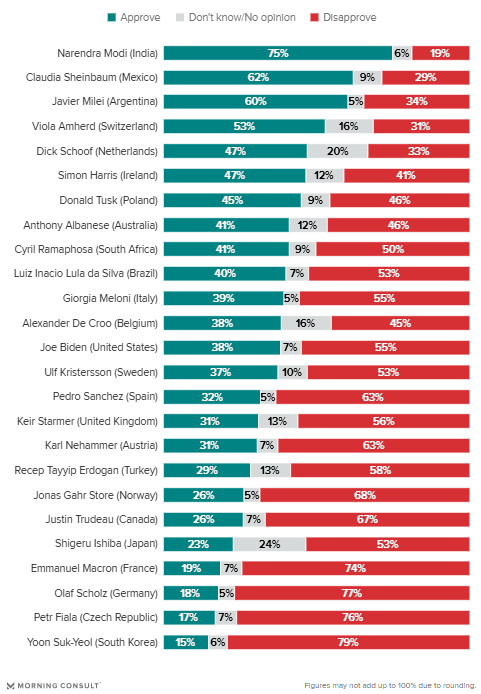 지난 6월 3연임에 성공한 인도의 나렌드라 모디 총리가 75%로 지지율 1위를 차지했고, 지난달 취임한 클라우디아 셰인바움 멕시코 대통령이 62%로 2위에 올랐다.