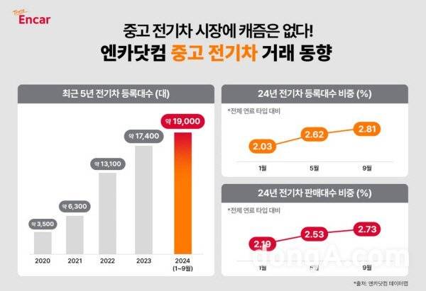 엔카닷컴은 올해 3분기(7~9월) 중고 전기차 실거래 대수가 전년 동기 대비 50.38% 증가했다고 분석했다. 최근 5년간 엔카닷컴에 등록된 전기차 매물 비중도 2020년 1~9월 0.32%에서 올해 같은 기간 2.64%로 늘었다.