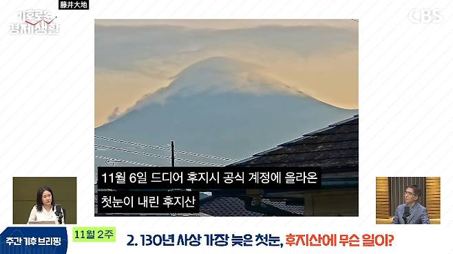 ◇ 최서윤> 네 다음은요. "130년 사상 가장 늦은 첫눈, 후지산에 무슨 일이 있었나."